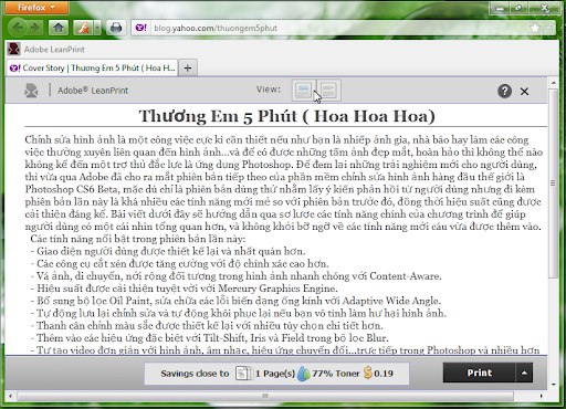 Khi muốn in trang web trên các trình duyệt web được Adobe LeanPrint hỗ trợ, bạn nhấn vào tổ hợp phímCtrl + Alt + P hay chọn vào biểu tượng hình máy in trên thanh địa chỉ. Bạn chờ chốc lát để quá trình tối ưu hóa trang in hoàn tất. Mặc định, trang in sau khi được tối ưu chỉ hiển thị chữ (Text only), nếu bạn muốn hiển thị thêm một số hình ảnh liên quan, bạn cần thiết lập lại tại mục View.